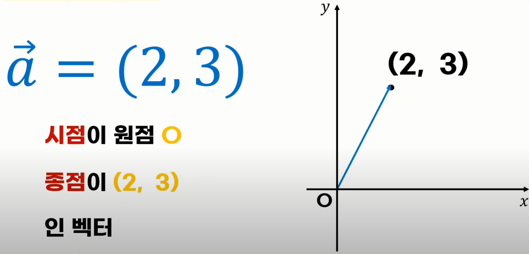 - 종점만 있는 벡터의 경우엔 점 O에 대한 위치벡터로 아래와 같다.