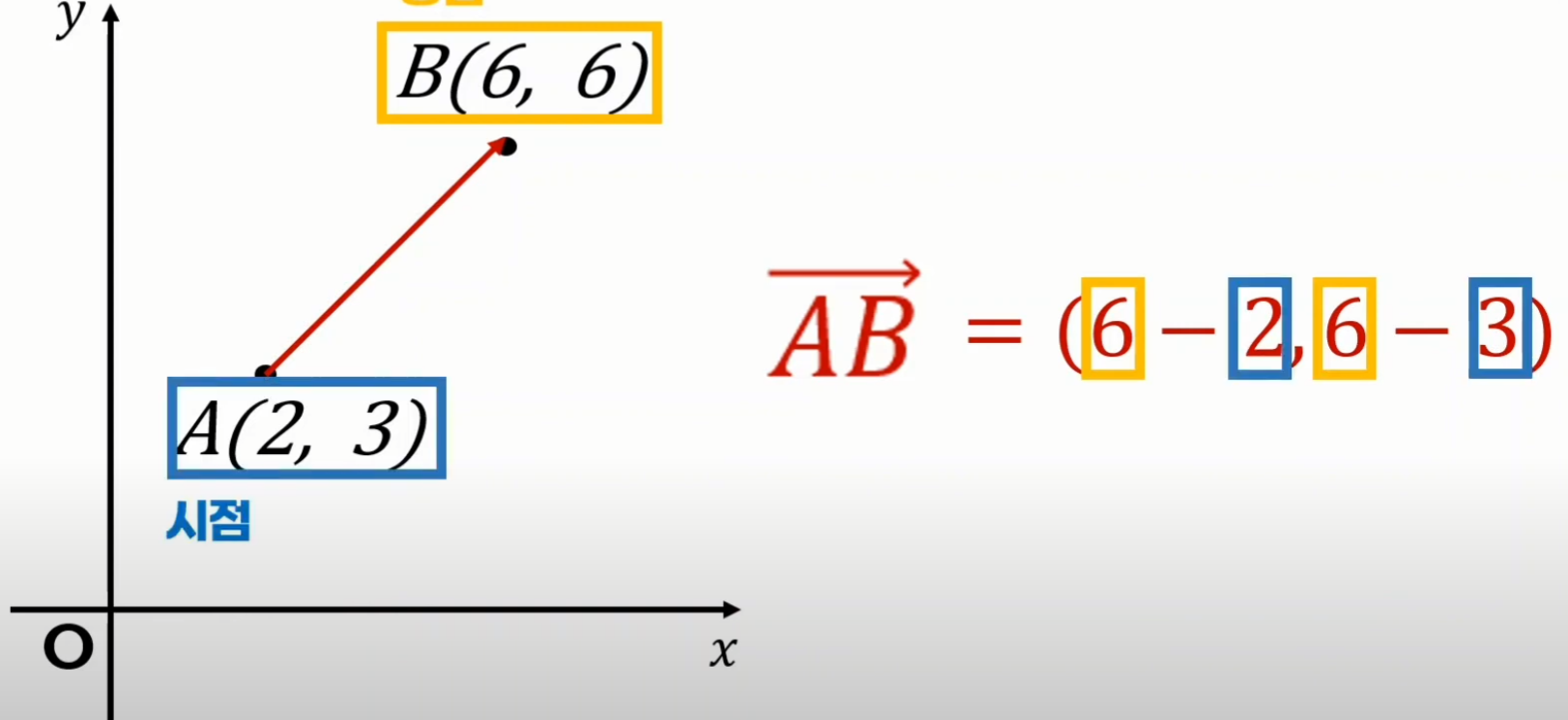- 그리고 전 시점이 A이고, 종점이 B인 벡터가 아래와 같다면